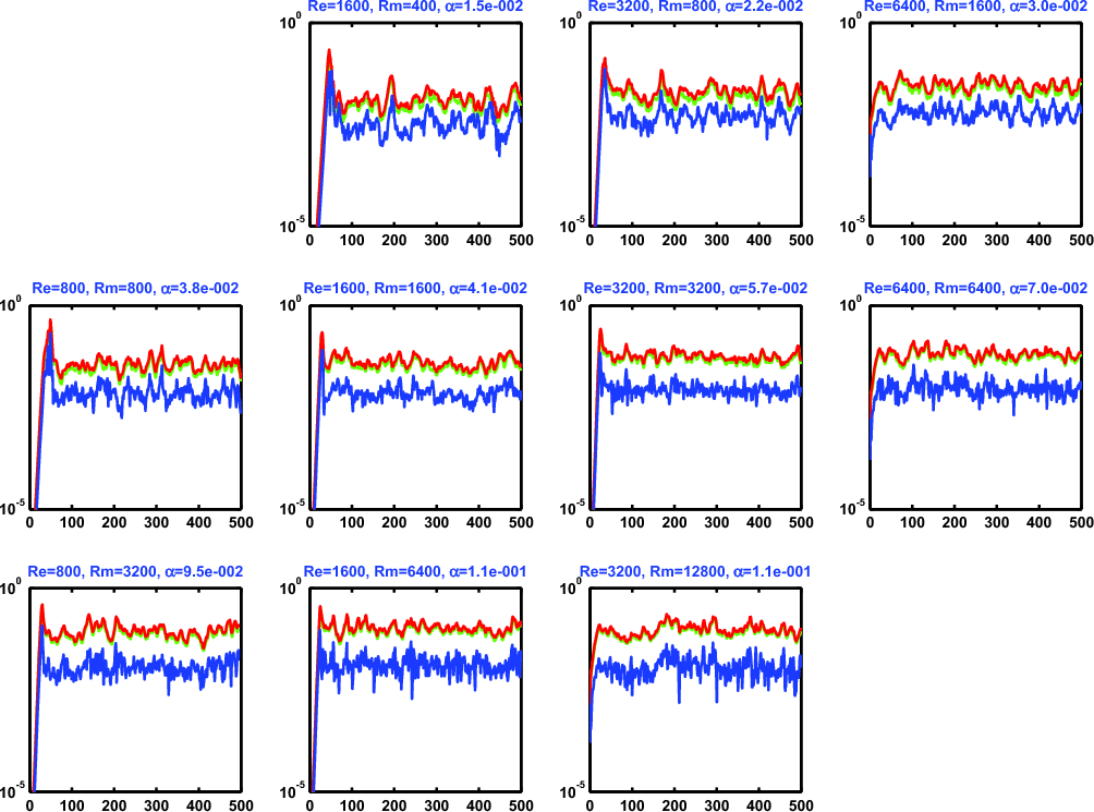 More generally, it is still unclear whether this dependence of the transport on physical dissipation is a consequence of the limited Reynolds numbers that can be achieved on present day computers. In particular, none of the published simulations has been able to capture the existence of a significant inertial range in the kinetic or magnetic energy spectrum, which makes it difficult to address this issue. The question here revolves mostly around the direction and locality of transfers and fluxes in Fourier space, and will be addressed elsewhere.