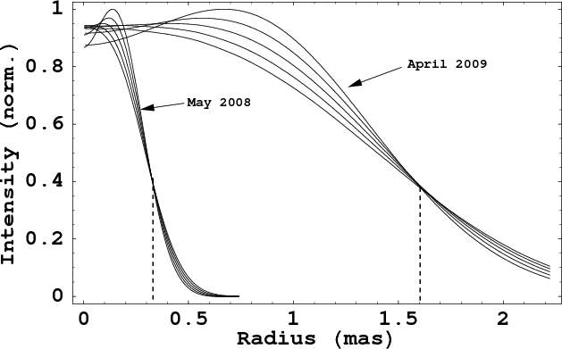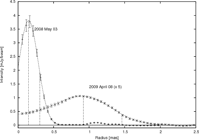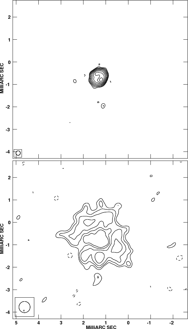 in two VLBI images separated by 11 months. The source shows a ring-like