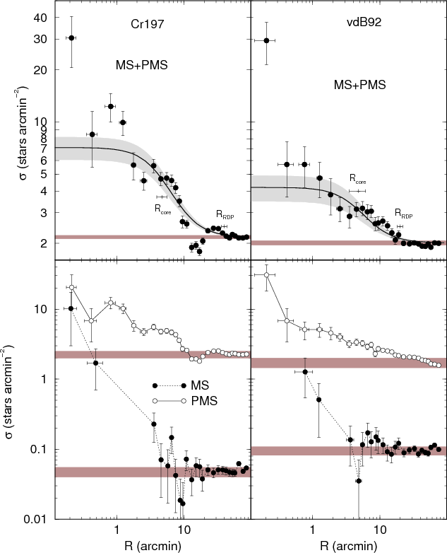 - Because of the relatively low number of stars in the present OCs, fluctuations in surface-brightness profiles are expected to be higher than those in RDPs. Alternative RDP fit functions are discussed in Bonatto & Bica (2008).