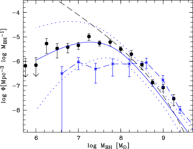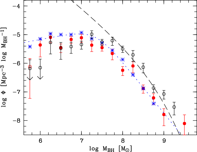 The observed relations between the black hole mass and the properties of the spheroidal galaxy component imply a close connection between the growth of supermassive black holes (SMBH) and the evolution of their host galaxies. For local galaxies a strong correlation between the mass of the SMBH and the luminosity or mass of the bulge component (Häring & Rix 2004; Magorrian et al. 1998; Marconi & Hunt 2003), as well as with the stellar velocity dispersion (e.g. Gebhardt et al. 2000; Gültekin et al. 2009; Ferrarese & Merritt 2000; Tremaine et al. 2002) have been established. Semi-analytical and numerical simulations also show the importance of black hole activity and their corresponding SMBH feedback for galaxy evolution (e.g. Booth & Schaye 2009; Croton et al. 2006; Springel et al. 2005; Cattaneo et al. 2006; Di Matteo et al. 2005; Khalatyan et al. 2008). It became clear that the central SMBH of a galaxy and especially its growth is an important ingredient for our understanding of galaxy formation and evolution.Therefore a complete census of the black hole population and its properties is required. Active black holes that will be observable as AGN are particularly important to study black hole growth. A useful tool to study the AGN population is the luminosity function (AGNLF). The observed evolution of the AGNLF has been used to gain insight into the growth history of black holes (e.g. Marconi et al. 2004; Merloni 2004; Shankar et al. 2009; Soltan 1982; Yu & Tremaine 2002), and it became clear that most of the accretion occurs during bright QSO phases. But, using the AGNLF alone usually requires some additional assumptions, e.g. for the mean accretion rate, and thus is affected by uncertainties and degeneracies. Disentangling the AGNLF into the underlying distribution functions, namely the active black hole mass function (BHMF) and the distribution function of Eddington ratios (ERDF), is able to provide additional essential constraints on the growth of SMBHs.