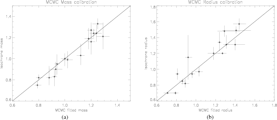 Figure 2: Shows the scatter in isochrone a) mass and b) radius values versus values from MCMC analysis for 17 SuperWASP host stars. |