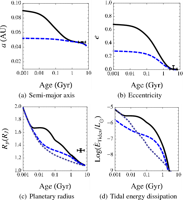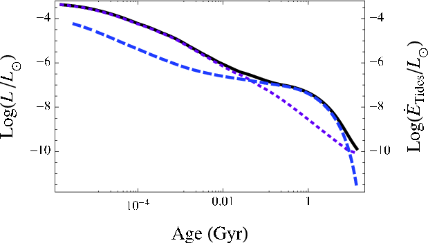 Figure 5: Internal energy balance in the evolving planet. Solid line: luminosity of the object with tidal heating. Dotted line: luminosity of the object without tidal heating. Dashed line: tidal energy dissipation rate. The object contracts as it cools until the energy input balances its thermal losses and sustains a higher entropy in the gaseous envelop, yielding a larger radius. |