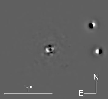 Figure 2: With the SDI+ADI pipeline reduced NACO/SDI frames of HD 104304. In the center of the image the residuals of the subtracted primary star can be seen. The white and black dots on the right half side of the image are the companion on the different orientated images. |