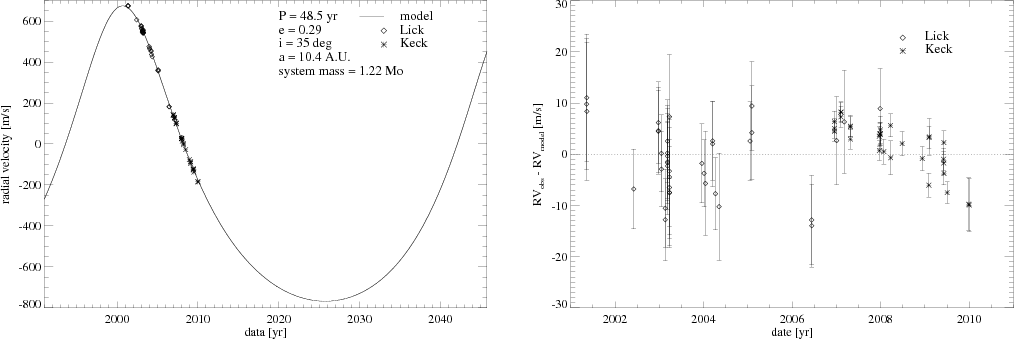an eccentricity of e=0.29 and a period of P = 48.5 years compares well with the RV data. The identification of the unconfirmed planet by Marcy (2007)
