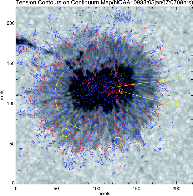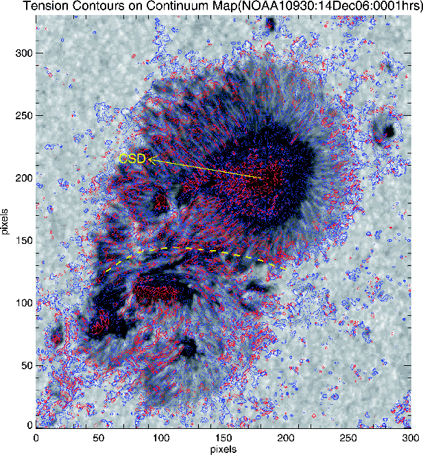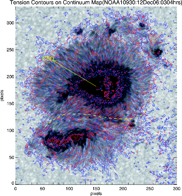 Apart from the penumbral features, we can also see several umbral features, including a light bridge at the western portion of the umbra. Even in this case, the regions of positive tension coincide with locations of weaker and more inclined fields. Finally, we notice several locations of upward directed tension at the edges of the filamentary penumbral structures. In Fig. 3, we show the contours of tension overlaid on the continuum map of NOAA AR 10930. Apart from the similar structures of positive and negative tensions as seen in the NOAA AR 10933 (Fig. 1), the polarity inversion line of NOAA AR 10930 also shows high magnitudes of tension (10-2 dynes/cm3).