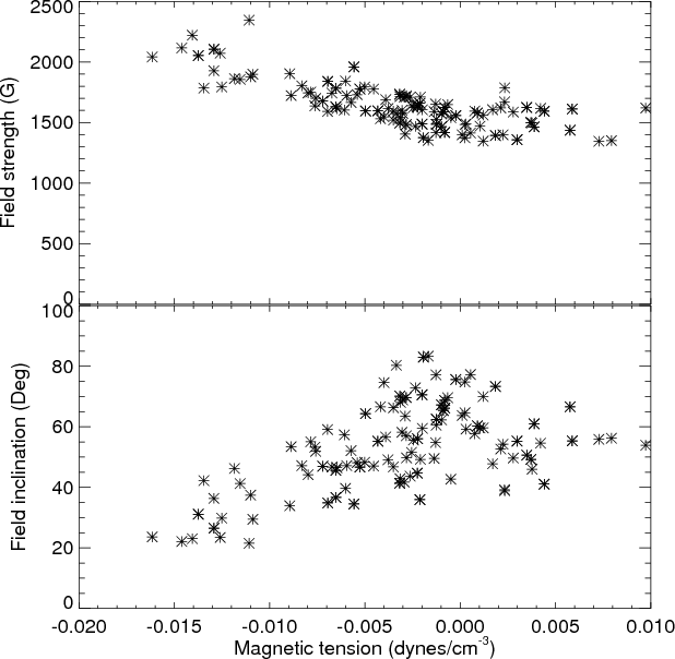 Figure 2: Upper panel: the scatter plot between magnetic tension and field strength along the arc shown in Fig. 1. Lower panel: the scatter plot between magnetic tension and field inclination along the arc shown in Fig. 1. |