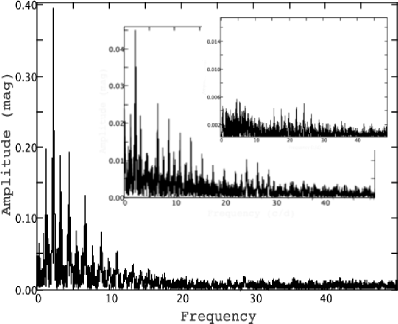 Figure 3: Fourier spectra on the light curve of S Arae. The insert panels respectivly show the prewhitened spectrum with the main pulsation frequency and its harmonics and the residual spectrum when all frequencies listed in Table 2 have been removed. |