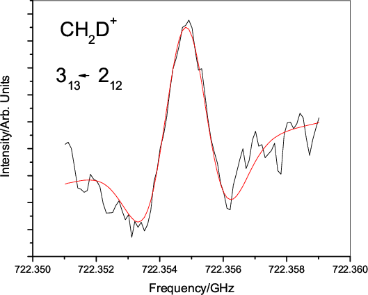 As this ion is a light asymmetric molecule and the signal was only weakly observed, four transitions were detected so far in the 280-890 GHz region. Figure 1 shows a typical example of the observed signals. All observed transition frequencies agree within 1 MHz of the predicted frequencies given by Rösslein et al. (1991), as listed in Table 1. The energy level diagram for the low-J states is illustrated in Fig. 2. Two astronomical lines identified as due to CH2D+ by Lis et al. (2009) are consistent with the laboratory frequencies.