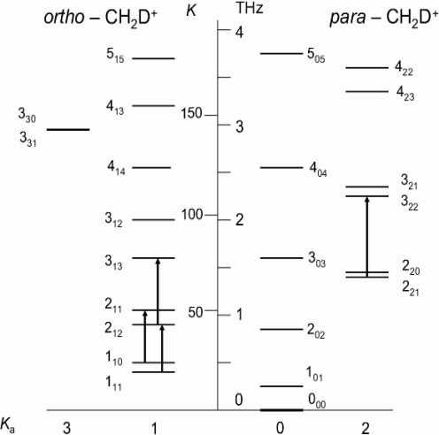 Figure 2: The energy level diagram for the low lying states of CH2D+. The arrows indicate the transitions observed in this investigation. |