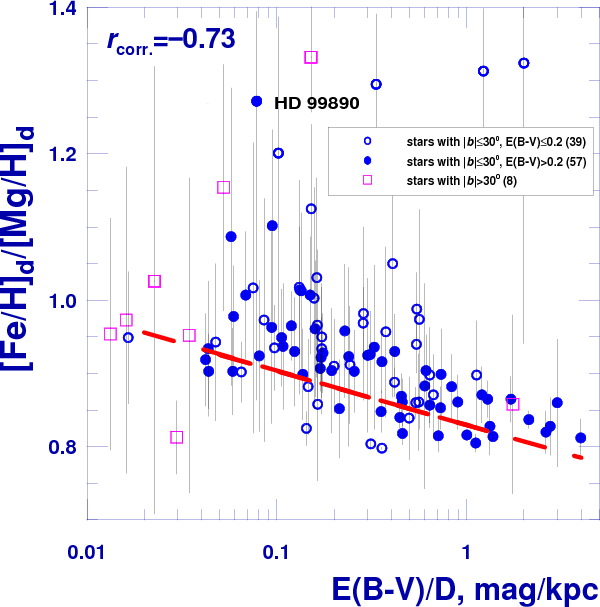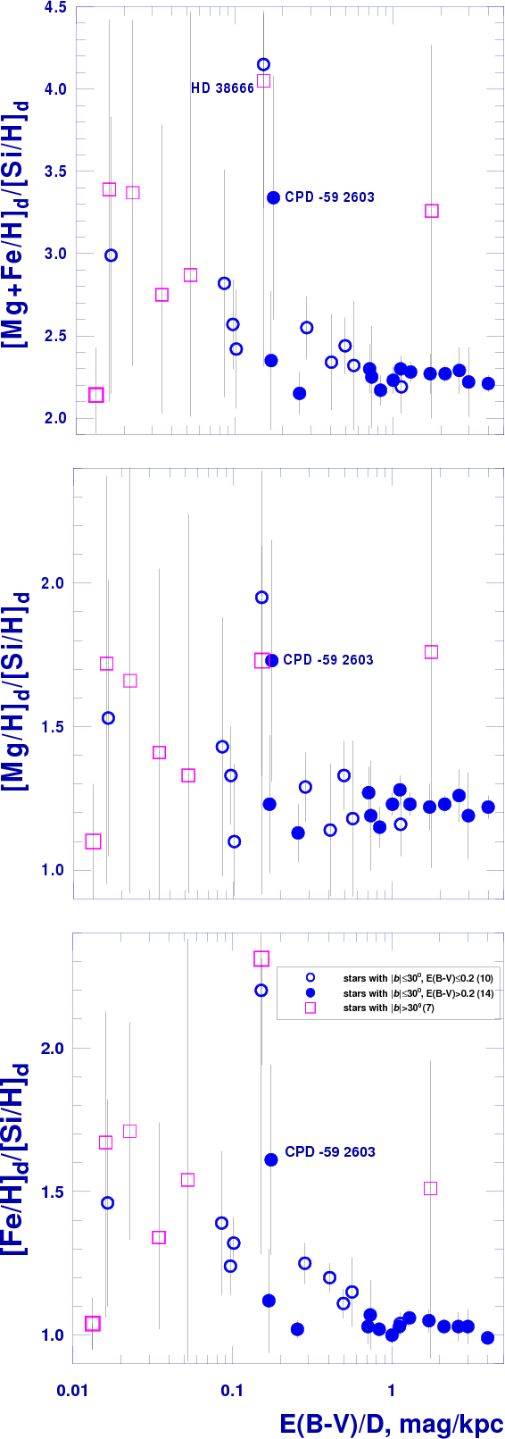 where anomalous high gas phase abundances of Mg, Si, and Fe are observed in this list of stars.