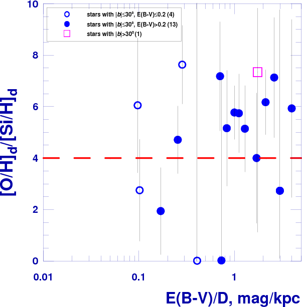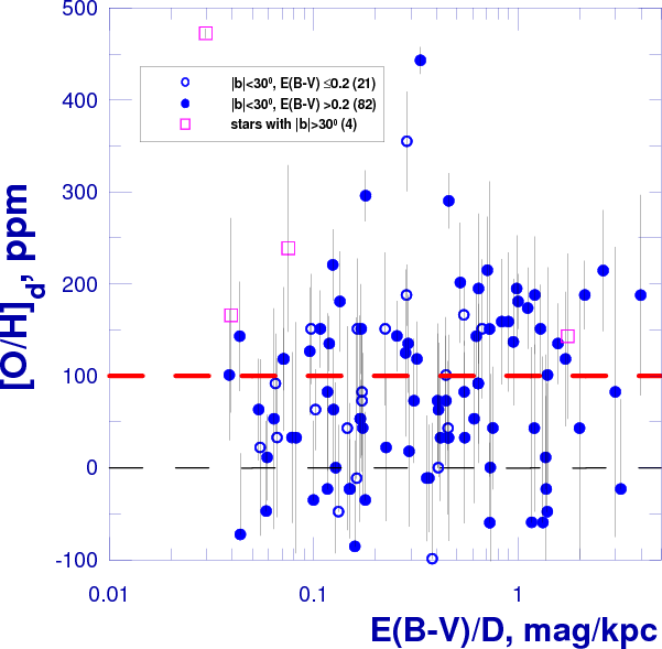 - Models of dust evolution predict a dust phase abundance of oxygen at a level of about 130 ppm at the modern time (see, e.g., Fig. 16 in Zhukovska et al. 2008).