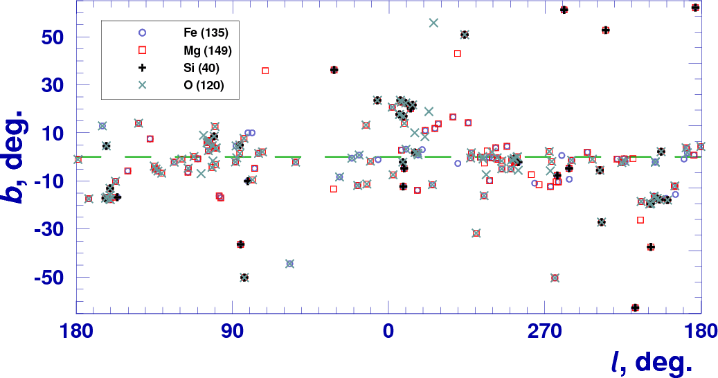 Figure 1: Galactic distribution of stars studied in this paper. Sightlines with measured Fe, Mg, Si, and O are shown by different symbols. Number of stars considered is indicated in parentheses in the legend. |