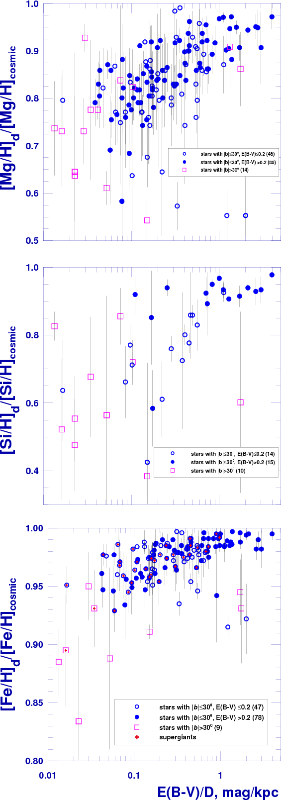 Interstellar space is filled with gas and dust. Both components interact with each other. Atoms and molecules collide with solid particles and cause grain growth or destruction (sputtering). It depends on the relative velocity. An examination of these processes is based on analysis of the observed gas phase abundances. Spectroscopic studies of interstellar UV absorption lines started in the 1970s have revealed a deficit of heavy elements in the ISM in comparison with cosmic (solar reference) abundances (Spitzer & Jenkins 1975). The missing atoms were assumed to be tied up in solid particles that opened an indirect way to investigate the element composition of interstellar dust. Modelling of interstellar extinction (e.g., Li & Greenberg 1997; Zubko et al. 2004; Voshchinnikov et al. 2006) has demonstrated that cosmic abundance constraints might be crucial in deciding on modern dust models.
