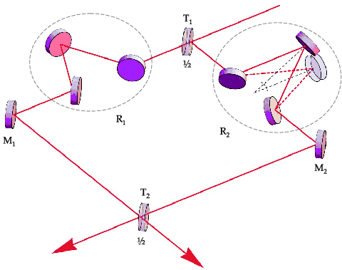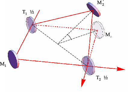Figure 2: Assembly of the MZI interferometer called ARC2 in the paper. The field rotation is obtained by folding one arm of the MZI. The rotation of M2 schematized here implies a corresponding rotations of the beamsplitters T1 and T2. |