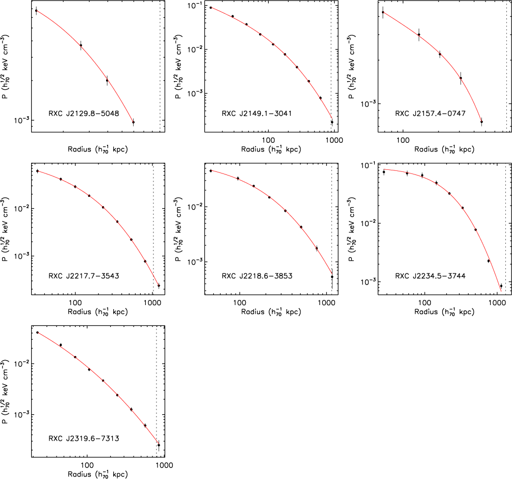 Figure C.1: Pressure profiles for the entire REXCESS sample with the best fitting GNFW model (red line). The dotted vertical line indicates R500 for each cluster. |