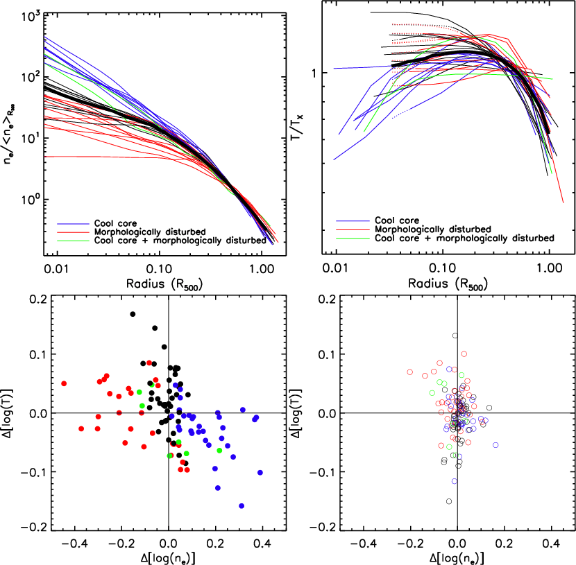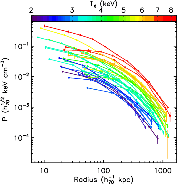 - The normalisation of the density profiles, scaled according to the standard self-similar model, varies with mass as shown by Croston et al. (2008).