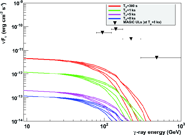 The time delay of the observation from the GRB has a clear impact, essentially because the observed SSC component is strictly related to the underlying synchrotron component which rapidly decays in intensity with time, depending on the specific environment and micro-physical parameters. Equation (10) goes roughly with t-1.1 which means that had MAGIC been able to start observations right at the start of the late afterglow phase (e.g. at T0 + 1 ks), the flux predictions would have increased by more than an order of magnitude. The time delay of about two hours, coupled with the poor observing conditions, were more than enough to depress the observed flux and raise the reported upper limits.