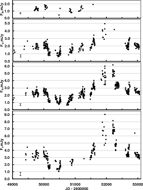 The magnitudes from Paper I were transformed to fluxes using the absolute calibration by Mead et al. (1990). Then, if there were several observations on some Julian Date, the mean values for fluxes in each band were calculated (thus, we ignore a possible fast variability within the night-IDV). But more often we found only one observation per night.