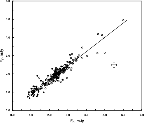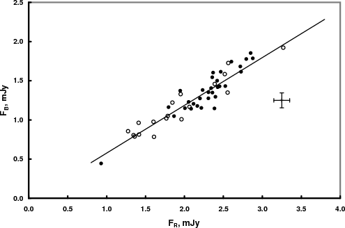 Flux-flux diagram FB vs. FR. Cross gives the mean error at the 1 |