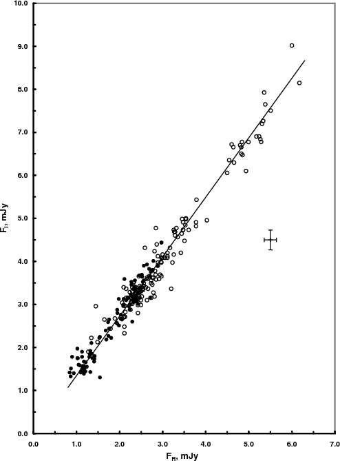 The obtained light curves are shown in Fig. 1, where the vertical segments give doubled mean errors. There is a trend in the light curves: before JD 2 450 700 the flux decreased on average (event 1), and after this date a flux increase is seen, which might point to the appearance of a new variable source with other colour characteristics (event 2).