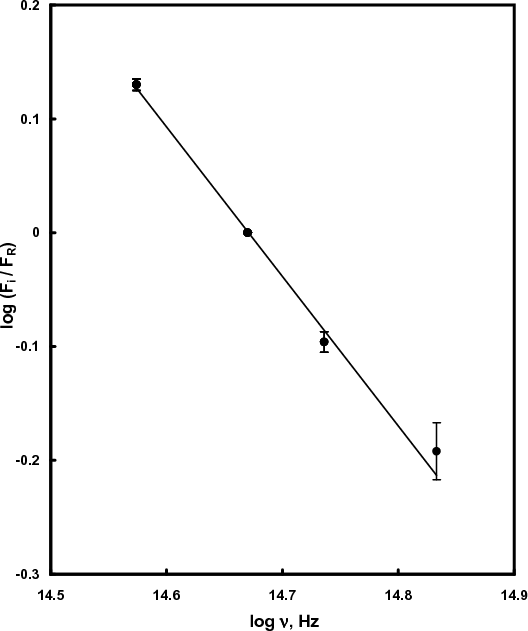 The slopes of these lines and their errors are given in Table 1 in the fourth column. (In previous columns the spectral band, corresponding logarithm of the frequency, and correlation coefficient between fluxes with its error are given.) The data in the fourth column give the observed relative SED of the variable component responsible for the long-term variability.