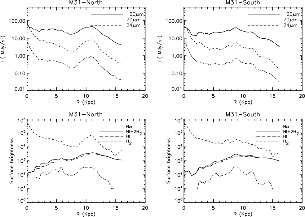 - Because the spiral structure is different in the northern and southern half (northeast and southwest of the minor axis, i.e. left and right of the minor axis, respectively), we present all radial profiles for each half separately.