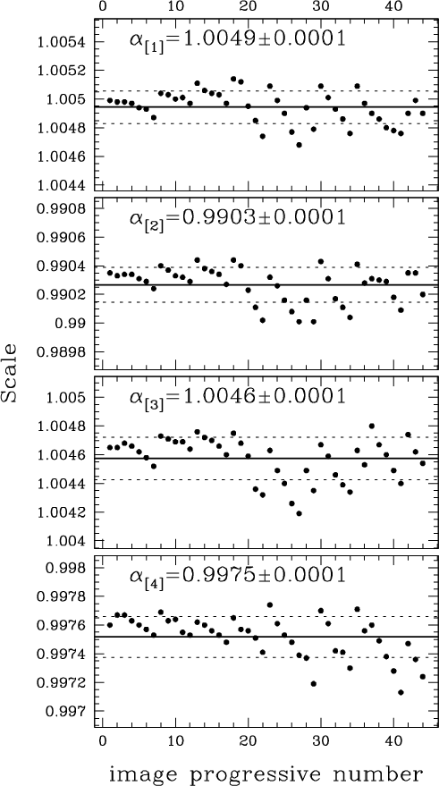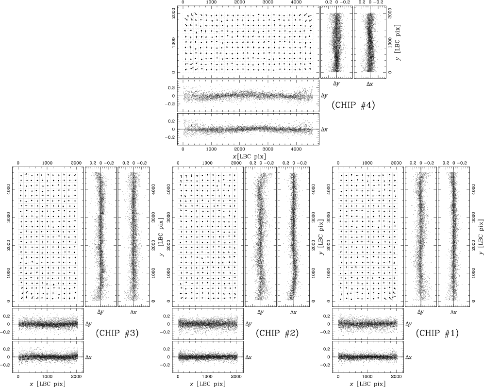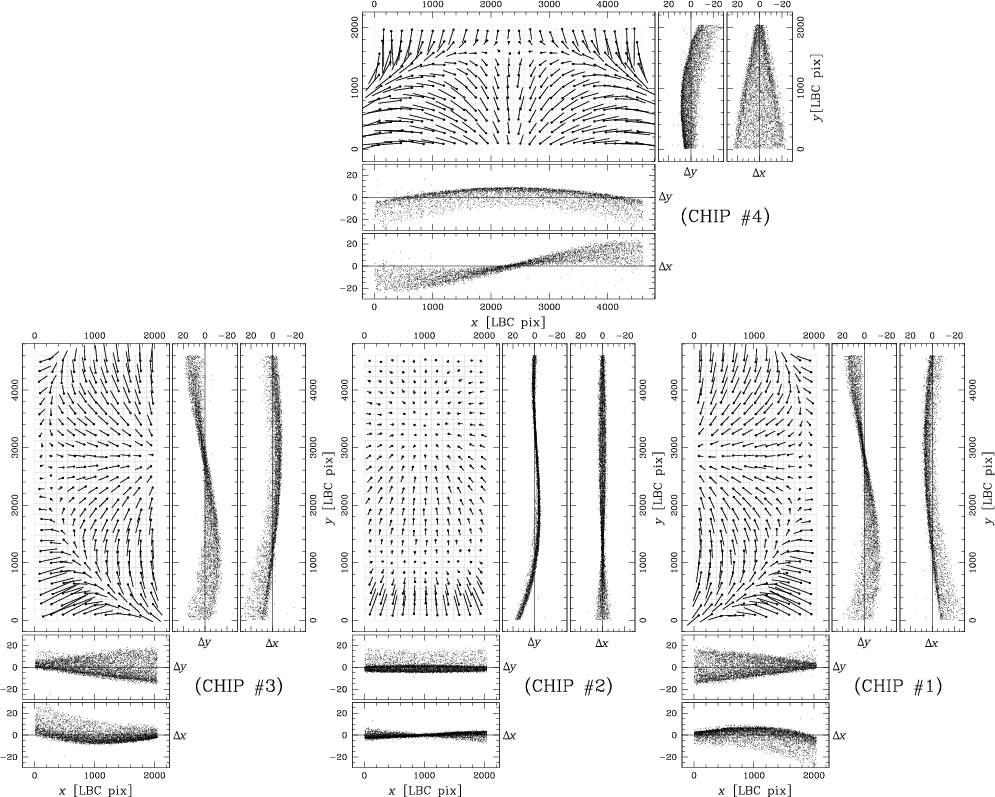 - Chip [2] occupies a central position within the LBC-blue layout (see Fig. 1), therefore we chose to adopt it as the reference chip with respect to which we compute relative scales, orientations, and shifts of the other chips.