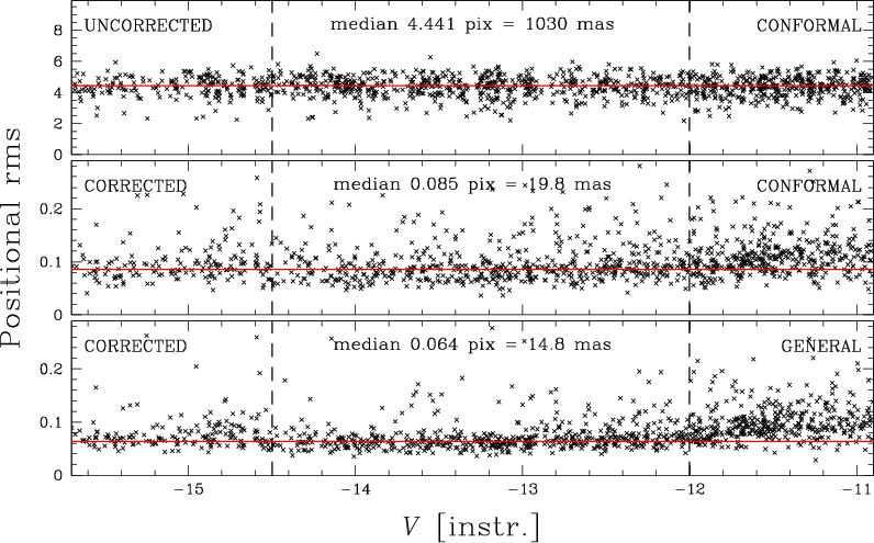 Left: dither pattern, in pixel units, of the Vimages used to solve for the geometric distortion. We used both small