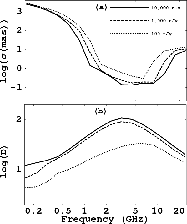 1 GHz, ionospheric effects dominate and the astrometry uncertainties (when the source is detectable) can be as large as