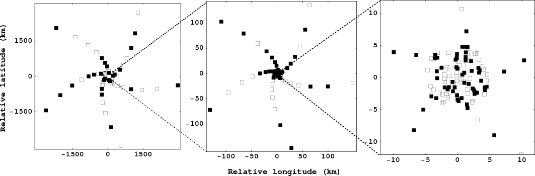 Figure 1: Array distribution used in our simulations (empty and filled squares). Axes are relative longitude (horizontal axis) and latitude (vertical axis) in km. Left, the whole array. Center, a zoom into the core. Right, a zoom into the inner core. The stations marked with empty squares were removed from the array in a second run of our simulations, to check the dependence of the results on different array distributions (see text). |