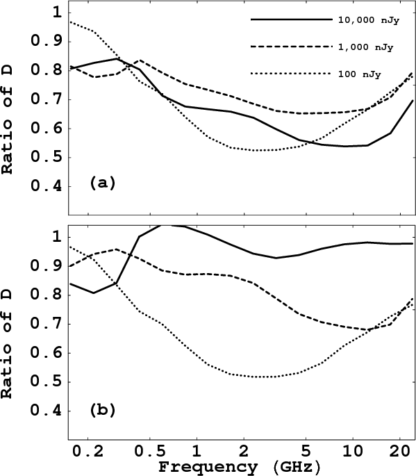 We repeated the simulations described in Sect. 5.1 using different arrays to compare the results with those obtained with the original array. On the one hand, we created a smaller array by subtracting 100 stations (those marked with empty squares in Fig. 1) from the original array. On the other hand, we created another array with all the 200 stations, but decreasing their sensitivity by a factor of 2. We show the results obtained in Fig. A.1. Special care must be taken interpretating these figures, given that the computed ratios of dynamic ranges are only meaningful when the detections of the sources are clear (i.e., when no spurious noise peaks appear stronger than the source). This is true for D > 20-30, which corresponds approximately to frequencies between 1 and 10 GHz (although it depends slightly on the source flux density, see Fig. 6).