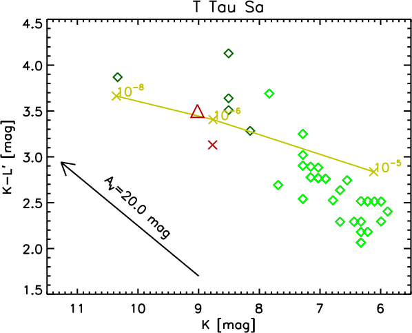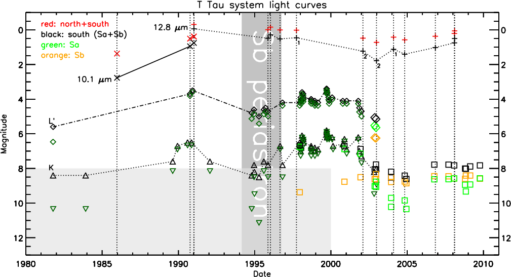 - The brightness of T Tau S increases from K = 7.4 mag on 1997 December 6 to K = 6.5 mag seven days later (Beck et al. 2004). Assuming Sb was constant at K = 8.6 mag, this implies that Sa went from K = 7.84 mag to K = 6.67 mag, i.e. it brightened by