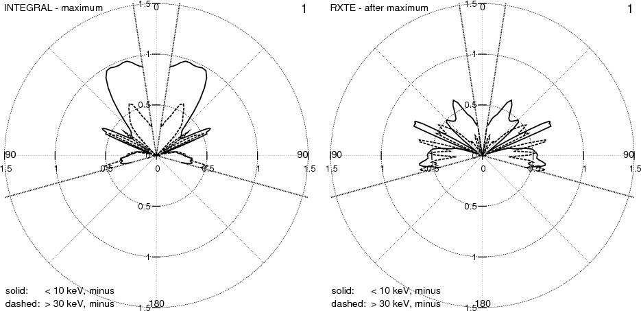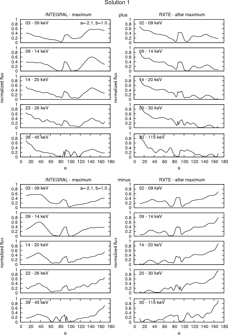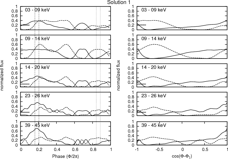 Figure 5: Decomposed single-pole pulse profiles of the data taken near the maximum of the giant outburst for the lowest energy band (same as the upper left diagram of the upper [solution 1] panels in Fig. 2) with proposed emission components derived from the beam patterns of the minus solution (Fig. 3, lower panel). We suggest that the emission from the first pole consists of emission from the halo (diagonally striped component) and from the accretion column (vertically striped). The dominant emission from the second pole seems to have its origin in the scattered photons in the upper accretion stream, which is visible while the second pole is behind the horizon of the neutron star due to gravitational light bending, while there is also a contribution from the accretion column (vertically striped). In this solution, the first pole gets closer to the line of sight than the second. |