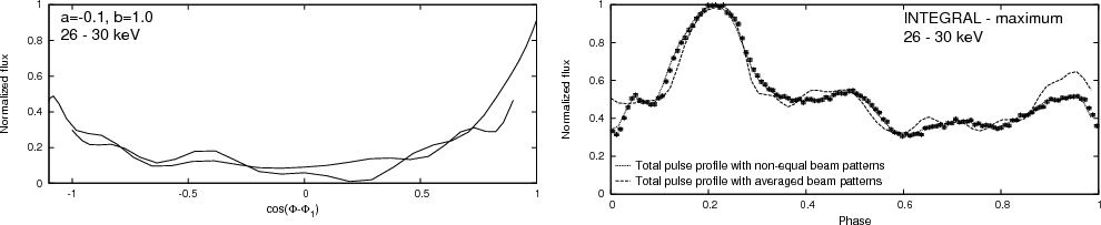 In X-ray pulsars, a neutron star accretes matter from a companion star via stellar wind or Roche lobe overflow. The accreted matter is channeled along the field lines of the strong magnetic field of the neutron star onto the magnetic poles. X-ray emission from the neutron star is produced in regions around the two magnetic poles. As the magnetic dipole axis is most likely inclined against the rotation axis of the neutron star, a distant observer sees pulsed emission. X-ray pulsars exhibit a wide variety of pulse shapes that differ from source to source. Generally, high-energy pulses have simpler shapes than low-energy pulses (Bildsten et al. 1997; White et al. 1983; Frontera & Dalfiume 1989, and references therein). If one assumes an axially symmetric geometry for the two emission regions of the neutron star in a dipole configuration, the observed pulse profile should be symmetric. However, the observed pulse profiles typically show an asymmetry. To explain the asymmetric shape of the total pulse profile, a distorted magnetic dipole field in which the two magnetic poles are not located opposite each other have been discussed (Riffert et al. 1993; Parmar et al. 1989a; Leahy 1991; Bulik et al. 1995). Kraus et al. (1995) shows that, starting from the observed, asymmetric pulse profile, it is possible to disentangle the contribution of the two emission regions of the neutron star. Once the pulsed emission from each of the poles has been obtained, one can derive the geometry of the neutron star. This again allows us to construct the beam pattern, i.e., the flux distribution from one emission region. Using this pulse-profile decomposition method, Kraus et al. (1996) have analyzed the pulse profiles of Cen X-3 and find indications of both pencil and fan beam. In the case of Her X-1, the results of the pulse-profile decomposition by Blum & Kraus (2000) have not only shed light on the beam pattern of the magnetic poles, but have also confirmed that a warped and tilted accretion disk attenuates the emission from one pole of the neutron star. For A 0535+26, the reconstructed beam pattern suggests that the emission comes from a hollow column plus a halo of scattered radiation on the neutron star surface (Caballero et al. 2010).
