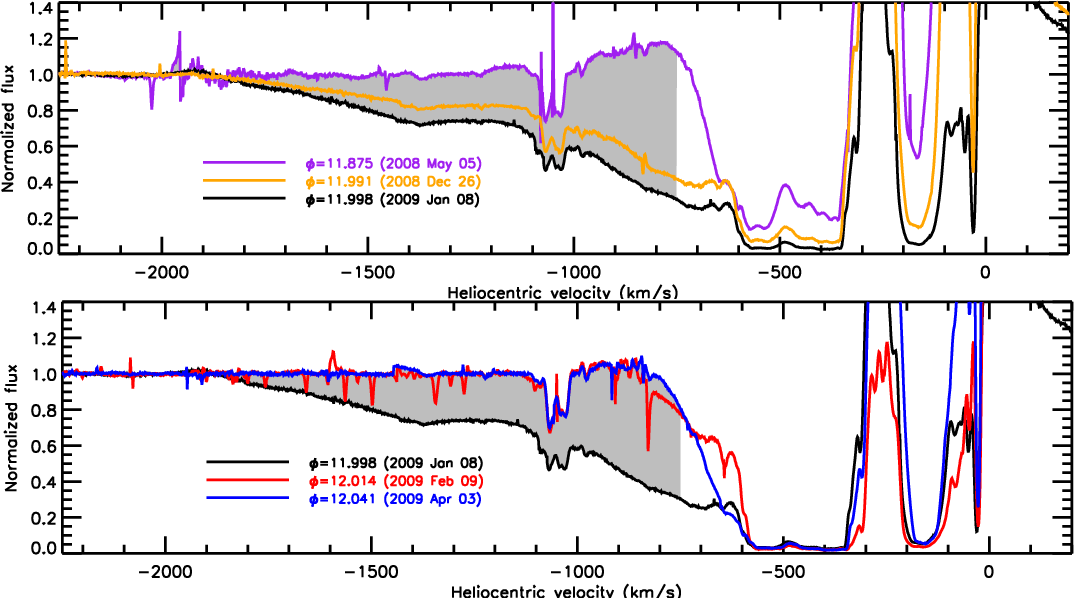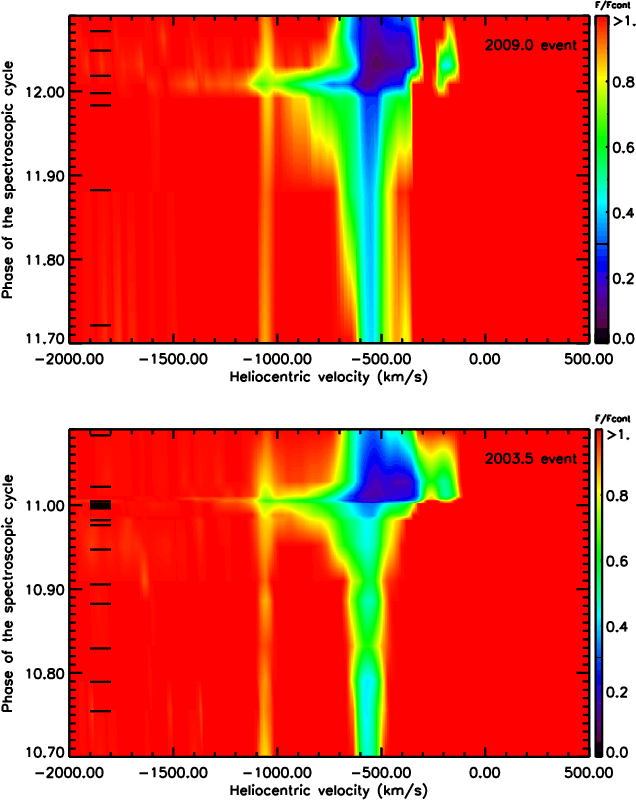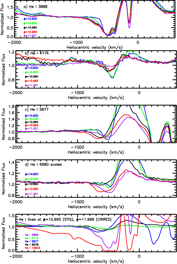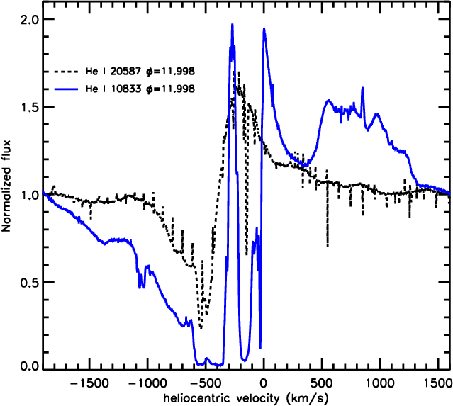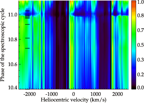 10833 during periastron. Based on the large OPD/LNA dataset, we determine that material with velocities more negative than