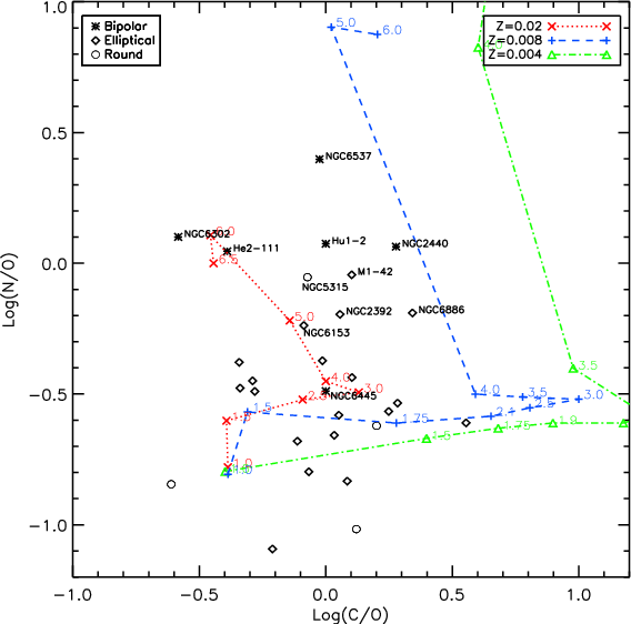 The helium, nitrogen and oxygen abundances with respect to hydrogen are listed in Table 1. The values of N/O are plotted in Fig. 2 as a function of He/H. The elliptical PNe are plotted as diamonds and the bipolar PNe as asterisks. It can be seen that six of the seven bipolar nebulae lie on the upper right hand side of the figure, while NGC 6445 lies somewhat by itself with a rather low N/O ratio but a rather high value of He/H. The two elliptical PNe which have a high N/O ratio and thus lie close to the six bipolar nebulae are M1-42 and NGC 5315. The abundances predicted by Karakas (2003) for stars of different initial masses are labeled with numbers in the figure indicating the masses used. These masses are connected with lines for each of the three different values of heavy element abundance Z.