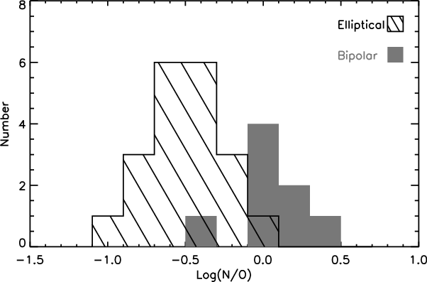 A histogram of the nitrogen/oxygen (N/O) ratio for the 33 PN listed in Table 1 is plotted as Fig. 1. Six of the seven bipolar nebulae have a very high log N/O ratio, between 0 and 0.4. The single exception to this is NGC 6445 which clearly has a lower value. Of the five round nebulae (not plotted), four have values of log N/O less than -0.66. The fifth nebula (NGC 5315) has a much higher log N/O ratio (-0.05), closer to that of the bipolar PN. All the elliptical nebulae have log N/O less than -0.8, but mostly in the range -1.0 to -0.4, with the exception of M1-42. This is a rather weak nebula and has been less well studied than the other PN. Thus we confirm the correlation between shape and N/O ratio and show that the morphology seems to change at a log N/O ratio of about -0.1.
