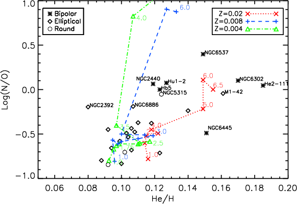 Figure 2: The N/O abundance ratio is plotted as a function of He/H. The dashed lines connect the results of the models of Karakas for a given value of Z. The ciphers give the initial masses of the individual models. The individual measured PN abundances are from Table 1. Those referred to in the text also have their names given. |