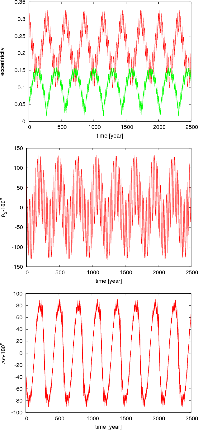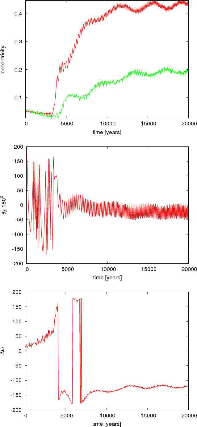 observations. In Fig. 6 the eccentricity of the inner planet tends to 0.5, while in Fig. 7 it will show only small amplitude oscillations around the value 0.3.