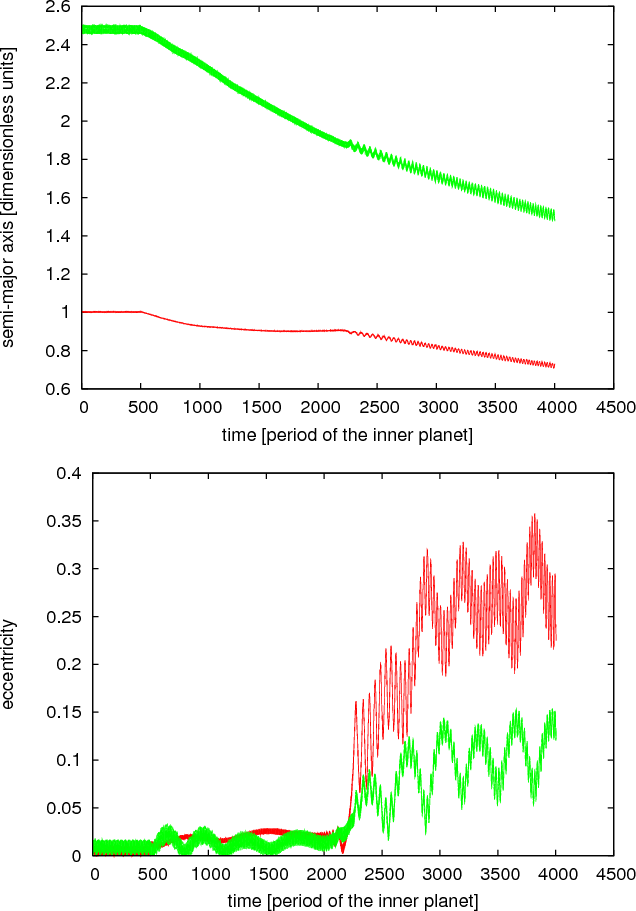 The upper panel shows the evolution of the eccentricities (inner planet