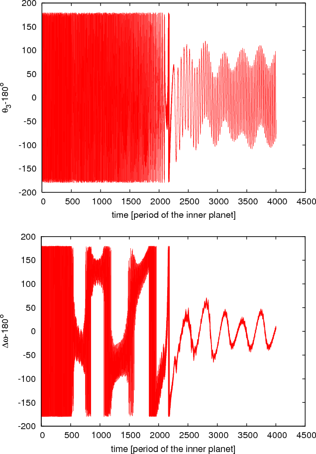 theoretical predictions of Beaugé et al. (2003) (asymmetric libration of the resonant angles), while in the second case the libration of the resonant angles is around