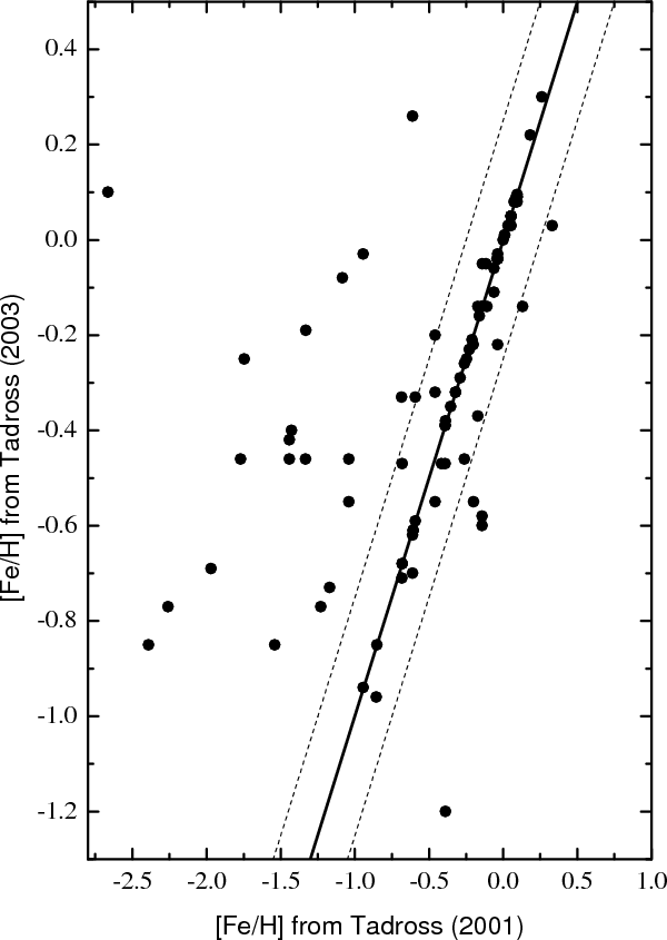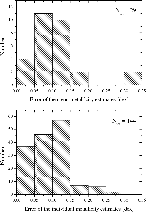The metallicity determinations obtained on the basis of isochrone fitting only, were not taken into consideration because the grid of isochrones are normally only sparsely available for the Z parameter (Schaller et al. 1992). Therefore, authors only consider whether the isochrones with a Z value higher or lower than that of the Sun, fit the observations more closely. One typical example is the paper by Piatti et al. (2006) who published Z = 0.040, corresponding to [Fe/H] = +0.37 dex, for the open cluster NGC 5288. Unfortunately, they do not include a corresponding plot with isochrones for the different metallicities.