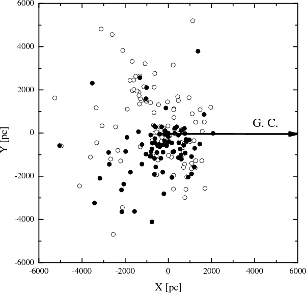 The cluster parameters (age, reddening, and distance) were taken from Paunzen & Netopil (2006). The only exceptions are Loden 807, NGC 7209, Ruprecht 20, and Ruprecht 32, for which the values were taken from the updated list of Dias et al. (2002) as well as Berkeley 1 and Ruprecht 46, for which the parameters from WEBDA were used. The distance from the Galactic centre was calculated in the standard way using 8 kpc for the Sun (Groenewegen et al. 2008). An error propagation was applied assuming that the uncertainties in the Galactic coordinates for the individual open clusters are negligible.