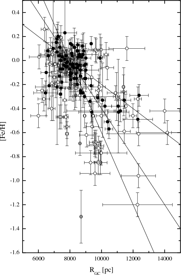 Looking at the global properties of our Milky Way, a radial metallicity gradient throughout the Galactic disk was discovered several decades ago, which provides strong constraints on the mechanism of galaxy formation. Models now show that the stellar formation as a function of Galactocentric distance strongly influence the appearance and the development of the metallicity gradients (Chiappini et al. 2001). Our knowledge is based on stellar data, for example those of Cepheids (Cescutti et al. 2007), or open clusters (Chen et al. 2003) as well as globular clusters (Yong et al. 2008). However, these approaches are still not satisfactory. All individual stellar estimates are limited to the accurate distance estimation of field stars and the uncertainties in the spectroscopic abundance analysis for very distant and therefore faint objects. The metallicity compilations of open clusters (for example Chen et al. 2003) are normally based on inhomogeneous data sets.
