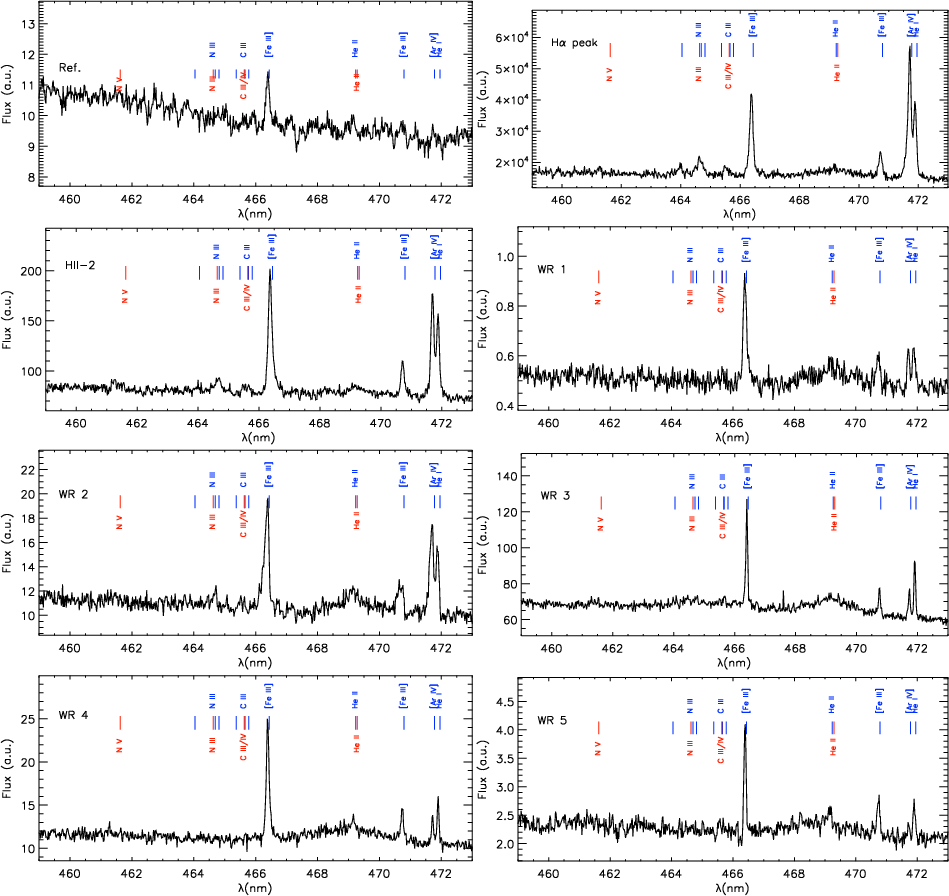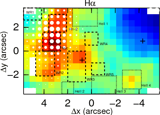 5 from the peak of continuum emission. Wolf-Rayet features are distributed in an irregular pattern over a larger area (