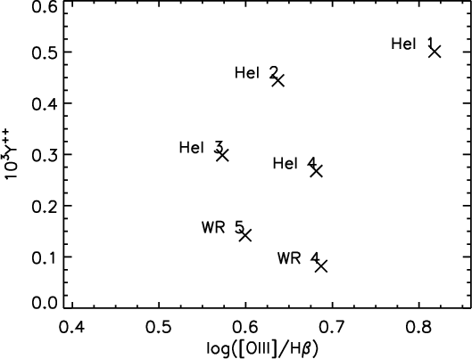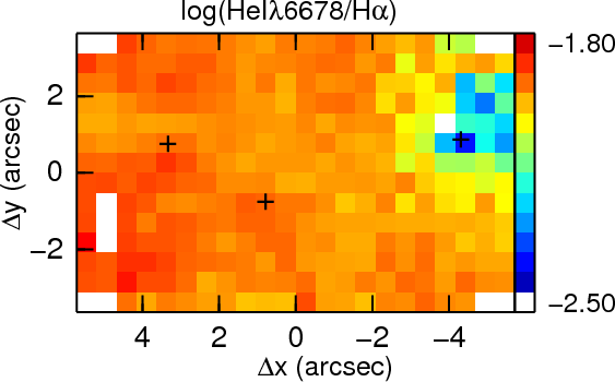 100 pc) and associated with young stellar clusters. We measured He+ abundances over most of the field of view and values of He++/H+