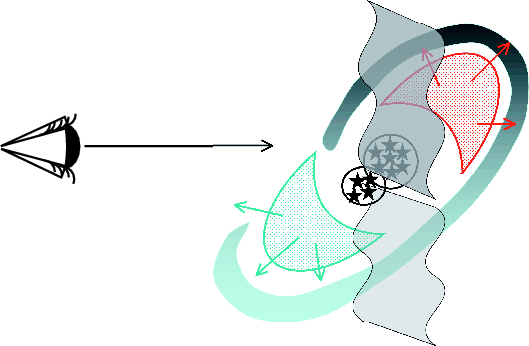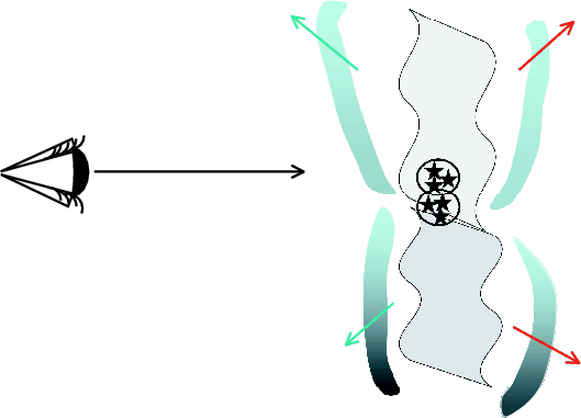 Figure 22: Sketch showing the different elements associated with the right part of the FLAMES field of view. The two massive SSCs (stars in the circles) have already expelled their material and are seen as relatively quiescent ionized shells (shown in grey). Differences in extinction are represented by two wavy sheets. |