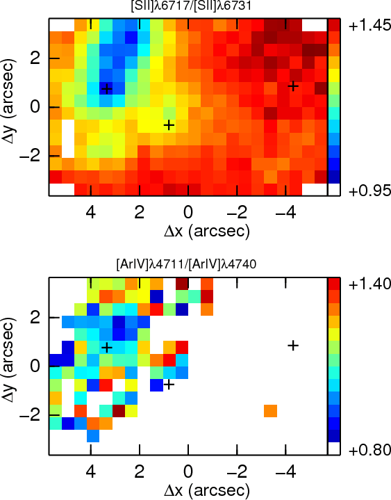 (790 cm-3) outwards, while the argon line ratio traces areas with