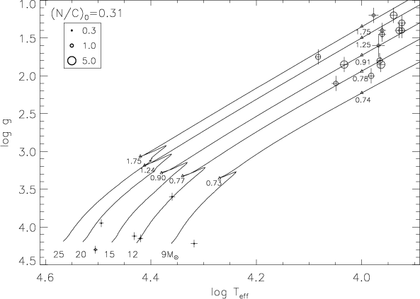 - The metal content (by mass) of the models is Z = 0.020, while a value of 0.014 seems more appropriate for the massive star population in the solar neighbourhood (PNB08). No fundamental changes to our conclusions are expected to arise from this difference. The tracks will shift a bit, in particular the zero-age MS towards higher gravities.