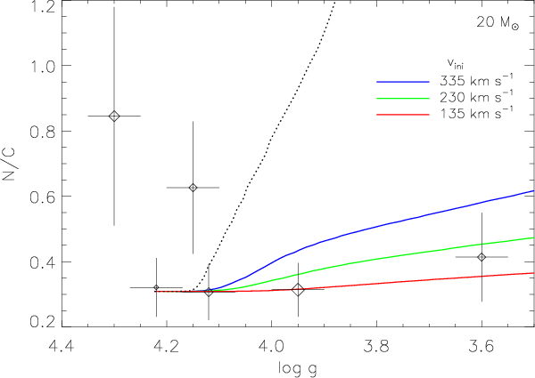 A theoretical understanding of early mixing of CNO-processed material to the stellar surface could not be achieved within the framework of evolution calculations for non-rotating stars with mass-loss, which were state-of-the-art at that time (e.g. Chiosi & Maeder 1986). The pollution of the surface layers with CNO-cycled material only occurs when the star reaches the red supergiant phase in such models, via convective dredge-up.